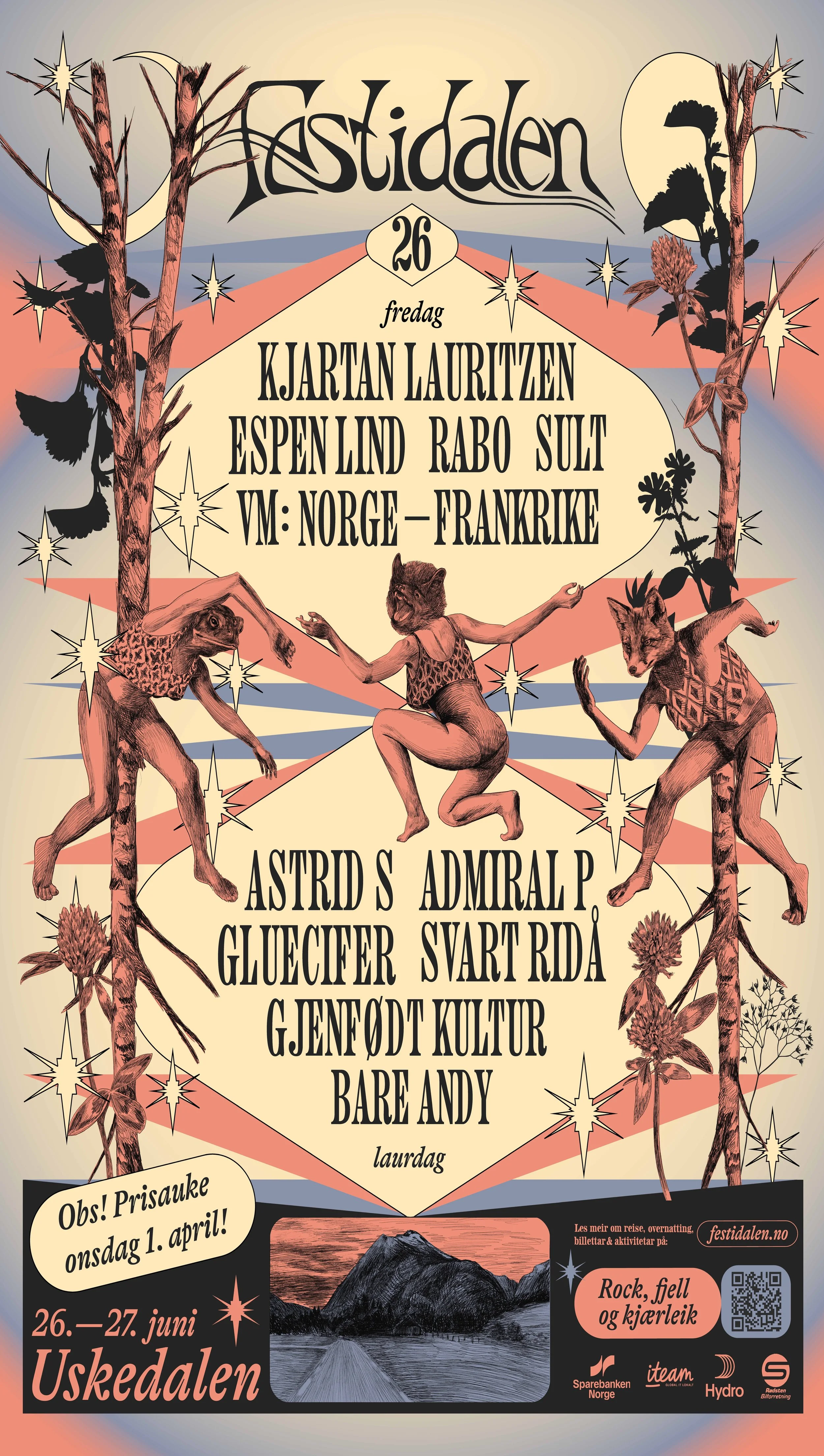 Laurdag fortset festen med Admiral P, Bare Andy, Gluecifer, GjenfÞdt Kultur og Svart Ridå. Astrid S er siste artist ut på Festidalen 2026.